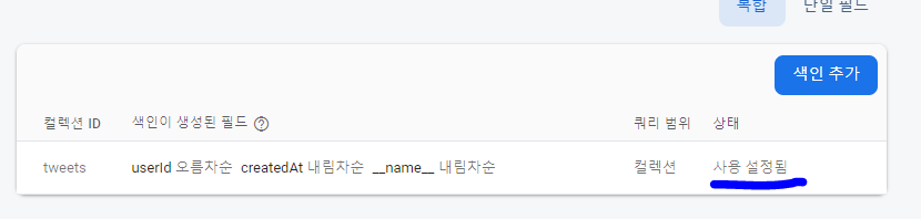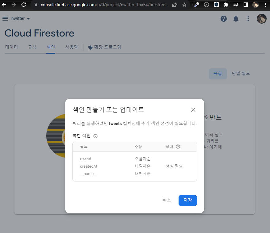 해당오류의 url을 누르면 index를 설정해줄 수 있는 firebase 사이트로 이동한다.