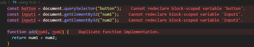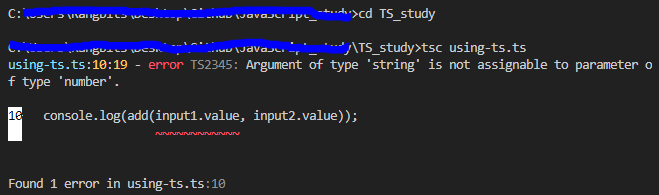 tsc using-ts.ts 작성하여 설치해둔 타입스크립트 컴파일러 호출